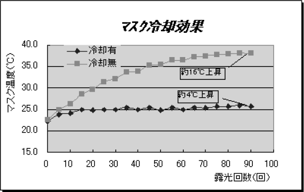 装置に使用するマスクの材質は石英を推奨している。石英とソーダガラスの熱膨張係数は各々1.3×10-7と8.3×10-6である。実際に露光する場合のマスク温度上昇は数十℃にも及ぶ場合がある。ソーダガラスでもマスク冷却を行う事により温度上昇をある程度押さえることが出来る。以下はマスク冷却有無の温度上昇差を測定したデータである。
