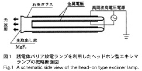 近年、特定波長域の光を効率よく放射する光源として、誘電体バリア放電を利用したエキシマランプの研究、開発が行われている。希ガス中で誘電体バリア放電を行うと希ガスのエキシマ光が放射されることは古くから知られていた1)2)。また、1988年以降ヨーロッパでは、希ガス又は希ガス-ハロゲンエキシマランプの実用化に向けた研究が行われてきた3)4)5)。