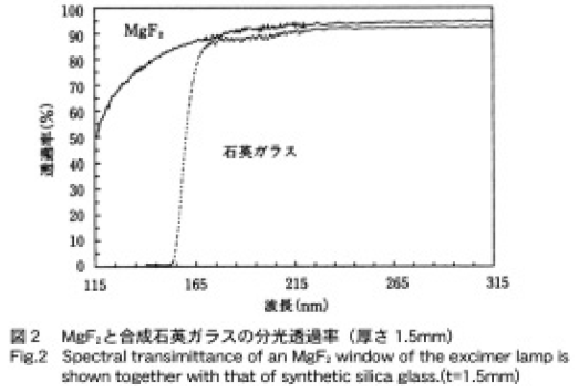 光取出し窓にはMgF2を用いた。使用したMgF2の分光透過率を図2に示す。参考のために、合成石英ガラス(厚さ1.5mm)の分光透過率を示した。MgF2の透過率は120nmで約60%以上の透過率があり、Ar2*およびKr2*エキシマ光は十分透過する。