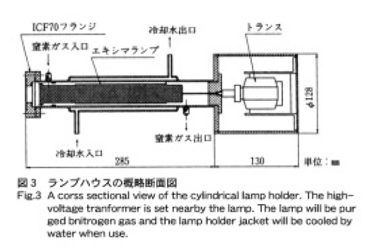 ランプハウスの先端にはICF70のフランジが取り付けてあり、MgF2のビュウポートを介して真空チェンバなどに取り付けることが出来る。ランプの光取出し窓からランプハウスの先端までは約10mmの空間がある。