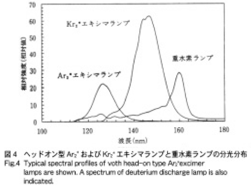 The head-on type Kr2* excimer VUV system produced monochromatic light at 147nm (with a 13.2 ― nm FWHM). It’s irradiance had an almost homogeneous distribution within a 15-mm diameter planar circle at 50mm from the output window and was about 1.4mW/cm2.
