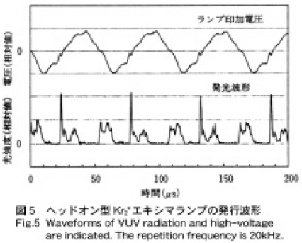 ヘッドオン型Kr2*エキシマ光照射装置の発光波形を測定した。発光波形は、1/10残光時間が80nsの蛍光体Y2SiO5:Ce3+と光電子倍増管を組み合わせたセンサで測定した。発光波形の測定結果とランプ印加電圧を図5に示す。ランプ印加電圧は少しひずんでいるが、正弦波に近い波形である。電圧の上がっている時と下がっている時に発光が観測され、その間で発光が休止している時間があることが確認された。また、上がっている時と下がっている時の電圧波形のわずかな違いによって、発光波形が著しく違った。これらは、誘電体バリア放電励起に起因する特有の現象である。