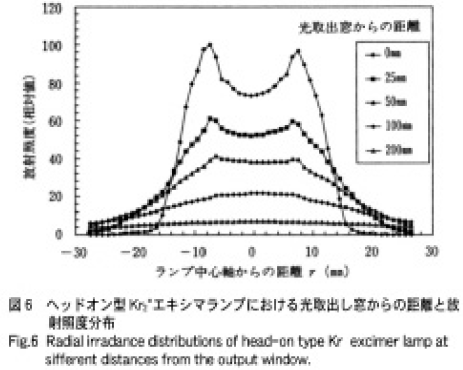 ヘッドオン型Kr2*エキシマ光照射装置による放射照度の空間分布を測定した。測定器は直径1mmのアパーチャ、サリチル酸ナトリウム、シリコンフォトダイオードを使ったセンサを用いた。光取出し窓からの距離を0、25、50、100、200mm に変えた場合において、ランプの中心軸に直行する面の放射照度分布を図6に示した。装置からセンサまでの間は窒素で置換した。放射照度は、光取出し窓とセンサの距離0mmの最大値を100としたときの相対値で示した。同軸中空形状ランプの軸方から放出される光を利用しているため、放射照度の空間分布は、光取出し窓との距離が近い場合にはカルデラ状の分布となるが、窓から離れるに従って均一な分布になった。放射照度むらが±5%以下になる円形面の直径は、光取出し窓からの距離が50mmおよび距離200mm において、それぞれ、直径15mm および直径24mmであった。ヘッドオン型Ar2*エキシマ光照射装置の場合もランプ形状が同じため、ほぼ同じ放射照度分布となった。