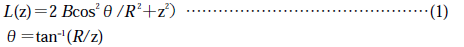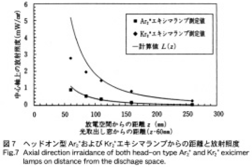 Bは光源の実効的光強度で、B の値はz=260mm の点で放射照度の測定値とL(z)が一致するように規格化した。cosθの二乗は光源が完全拡散性であることと、センサへの入射角を考慮したものである。距離の遠いところでは計算値と測定値はほぼ一致したが、距離の近いところでは測定値は計算値より低かった。ヘッドオン型エキシマランプは指向性を持った光を放出していることがわかった。Ar2*エキシマランプとKr2*エキシマランプの光減衰特性に差が生じているが、この差の原因は解明できていない。距離50mにおける放射照度はAr 2 *エキシマ光照射装置の場合約0.4mW/cm2、Kr2*エキシマ光照射装置の場合約1.4mW/cm2であった。