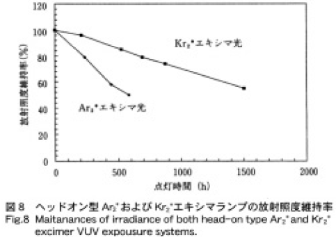ヘッドオン型Ar2*およびKr2*エキシマランプの光出力の点灯時間による変化を図8に示す。出力半減までの時間は、Ar2*エキシマランプの場合約500 時間、Kr2*エキシマランプの場合約1500 時間であった。出力の減衰原因は、分光透過率を測定した結果、MgF2の劣化によるものと考えられる。MgF2による劣化は、200nm以下では全体に起こり、分光分布のプロファイルは、ほとんど変わらなかった。
