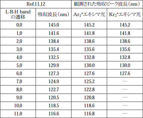 分光分布の測定結果を図9に、観測された吸収ピーク波長とL-BHbandを表1に示す。窒素ガスで置換した場合に観測された吸収ピーク波長は、L―B―H bandの各波長に一致した。置換したガスがアルゴンガス、窒素ガスの両方の場合において、Ar2*エキシマ光の124nmの波長に吸収が現れた。光路を縮めたときには、この吸収は現れなかったので、光路間の不純ガスの影響と考えられるが吸収種は同定できていない。