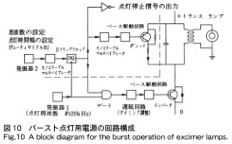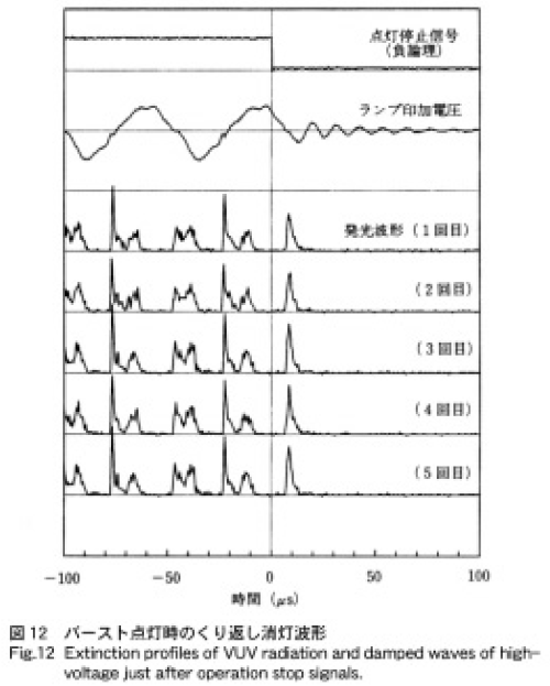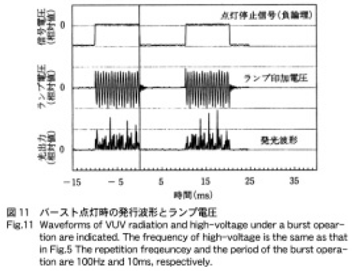 プラズマディスプレーパネル(PDP)は、放電ガスとしてXe を使用し、Xe 原子の共鳴線147nmで、蛍光体を励起する方式が多い。Kr2*エキシマ光は中心波長147nmであり、Xeの共鳴線とよく一致しているため、蛍光体開発、評価用光源として用いられ始めた。PDP用蛍光体に求められる重要な特性の一つとして、残光時間がある。エキシマランプのバースト点灯は、残光特性測定を目的に開発した。