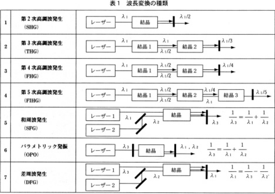 非線形波長変換による短波長光発生の基礎となるのは、3つの光が非線形光学媒質内の2次非線形感受率を介して相互作用し、そのエネルギーを交換しあう3波混合である。一般に、非線形媒質に入射させる光は1 つ、ないし2つであり、残りの2つないし1つがノイズレベルから立ち上がって増幅させられ、結果として入射光とは異なる波長の光の発生が実現させられる。非線形波長変換による短波長光発生の基礎となるのは、3つの光が非線形光学媒質内の2次非線形感受率を介して相互作用し、そのエネルギーを交換しあう3波混合である。一般に、非線形媒質に入射させる光は1 つ、ないし2つであり、残りの2つないし1つがノイズレベルから立ち上がって増幅させられ、結果として入射光とは異なる波長の光の発生が実現させられる。