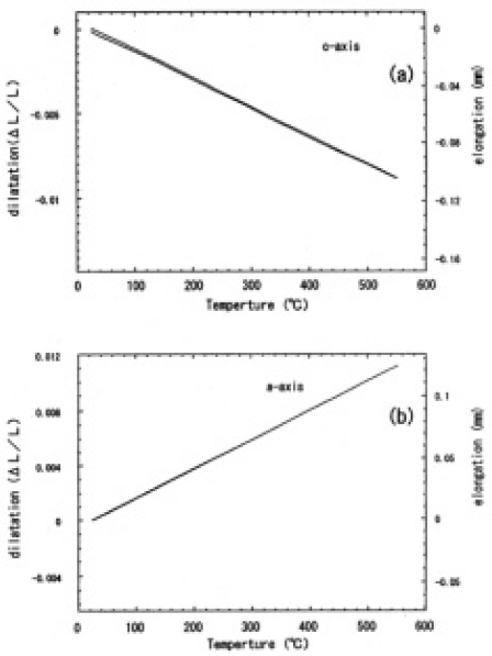 Takei et al.1) reported the thermal expansion of CLBO for the first time by measuring lattice constants using a high-temperature X-ray powder diffractometer, and found that the thermal expansion coefficient along the c-axis is negative, while that along the a-axis is positive. However, as they reported in the literature, the X-ray diffraction lines became considerably broad at elevated temperatures, which may lead to fluctuaiton of the lattice constants. In addition, the lattice constants changed abruptly to about 100°C, showing irregular jumps from room temeprature to 100°C. CLBO belongs to a tetragonal symmetry from the growth temperature to room temperature (RT); therefore, the jumps of the lattice constants must be caused by measurement processes.