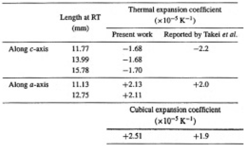 The cubical expansion coefficient defined as ΔVV0Δ T was 2.51x10-5/K, as listed in Table I, which also doesn’t coincide fairly with the reported one, 1.9x10-5/K.1) This discrepancy must result from the difference in thermal expansion of the c-axis.