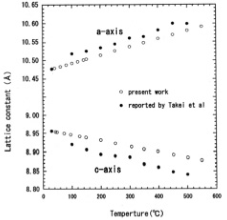 Takei et al.1) reported the thermal expansion of CLBO for the first time by measuring lattice constants using a high-temperature X-ray powder diffractometer, and found that the thermal expansion coefficient along the c-axis is negative, while that along the a-axis is positive. However, as they reported in the literature, the X-ray diffraction lines became considerably broad at elevated temperatures, which may lead to fluctuaiton of the lattice constants. In addition, the lattice constants changed abruptly to about 100°C, showing irregular jumps from room temeprature to 100°C. CLBO belongs to a tetragonal symmetry from the growth temperature to room temperature (RT); therefore, the jumps of the lattice constants must be caused by measurement processes.