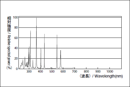 図2 クセノンランプをベースに水銀などの金属蒸気を封入した、高輝度・点光源のDeep UVランプは、より微細な半導体回線パターンの露光用として開発されたもので、遠紫外線に強いスペクトルを持っています。さらに、この領域の波長は化学的に活性であることから、焼き付け以外の用途も研究されています。