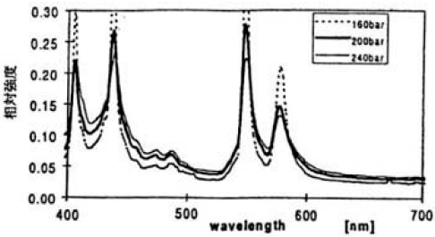 水銀蒸気圧が5気圧程度の高圧水銀ランプの発光スペクトルにもわずか連続スペクトルが見られるが水銀蒸気圧が約100気圧程度以上から、連続スペクトルの発光が顕著になる。約150気圧に達すると液晶プロジェクタ用光源としてかなり良好な発光を示すようになるが、特に約200気圧になると水銀原子の線スペクトルの発光がかなり小さくなり、良好な光源になる。この水銀蒸気圧と発光スペクトルの関係については、古くより幾つかの測定例が報告されているが(1)他、図3に最近の報告例を示す(5)。
