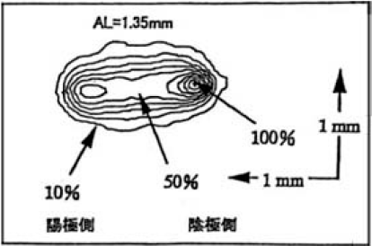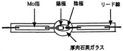 直流点灯型超高圧水銀ランプの構造図を図4に示し、図5に200W超高圧水銀ランプの輝度分布の例を示す。