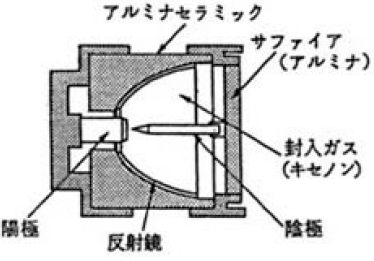 30Φ~40Φの反射鏡を内蔵したアルミナセラミック製キセノンランプで前面の窓はサファイアでできている。定格入力75W~300Wのランプがファイバー照明用として使用されているが、液晶プロジェクタ用には400W~800W程度の高出力ランプが使われている。アーク長は1.2~1.5mmである。1000~2000lmのプロジェクタ出力が得られている。図6にセラミック製キセノンランプの断面構造例を示す。