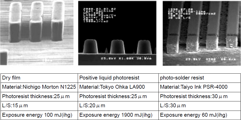 As resolution samples of the process performed by USHIO's exposure system, the following shows SEM photographs of three photoresist types processed by the projection exposure method.