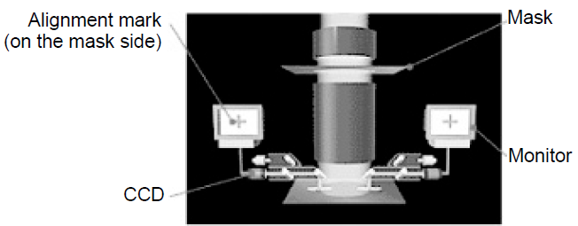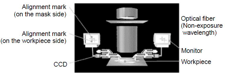 As the alignment method, USHIO's exposure system utilizes on-axis TTL alignment using a non-exposure wavelength. The projection lens is usually designed to obtain the required resolution with the exposure light (to correct the aberration). For this reason, off-axis alignment is generally used to partially radiate the exposure wavelength as an alignment light. Use of the exposure wavelength for alignment causes the area surrounding the alignment mark to be exposed during alignment. If the required resolution is low, it can be considered to use the projection lens that corrects the aberration with two lines: the exposure wavelength and the non-exposure wavelength (generally 546 nm). However, as the required resolution becomes higher and the exposure area becomes larger, this method may not be used.