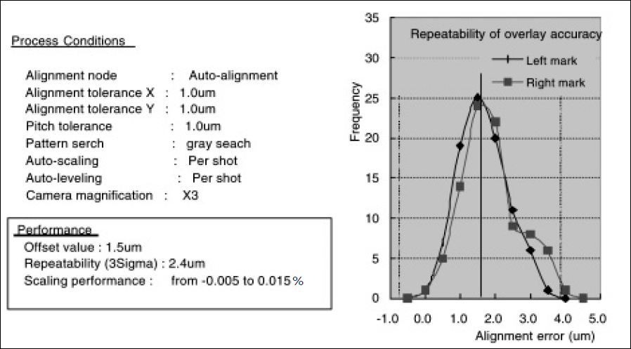 The variances at the alignment mark estimated from the log data obtained during exposure process were 2.3 through 2.6 µm (3 σ). The measurement results of the actual workpieces include variance of the measurement repeatability and variance of each alignment mark. Therefore, it can be considered that these results are greater than the variances estimated from the log data.