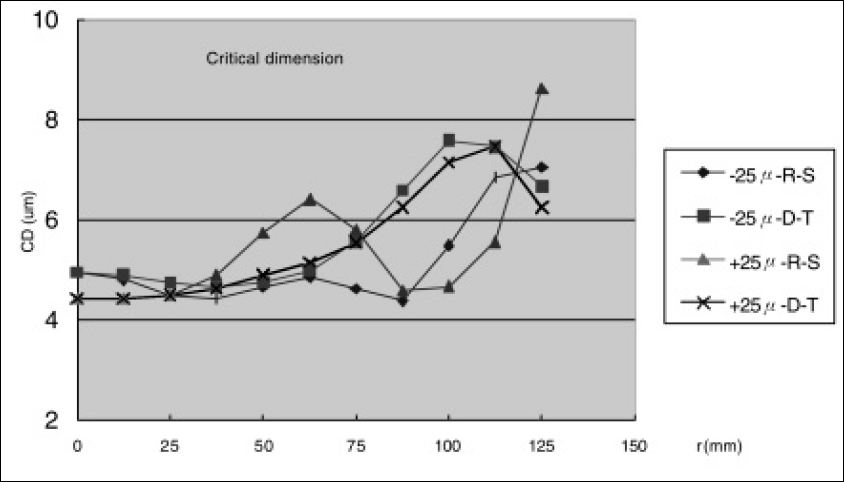 Among the exposure performance , the critical dimension (CD) of the pattern play an important role for the yield. CD is essential performance of PWB manufacturing . In additionto the exposure lens performance, CD is influenced by the resist performance and development condition . We have evaluated due to dry-film resist. Effective exposure area is 250mm diameter.