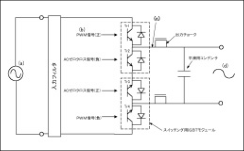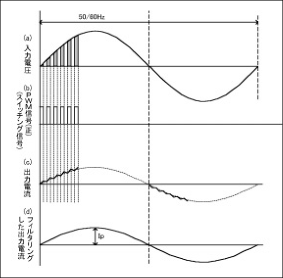 図2にPWM制御パワーモジュールの回路構成の一例を示す。また、図3に各段(図2中のa~d点)での動作波形を示す。正弦波の入力電圧(a)をスイッチング回路Tr1~Tr4で切り取る。切り取る幅はPWM信号(スイッチング信号:b)で制御する。切り出した出力電流(c)を平滑回路でフィルタリングして平滑化し正弦波に戻す(d)。出力電力の調整はPWM信号の幅を変えることにより切り取る幅を変えて行う。この制御方式では、出力電力を変化させても出力電流の波高(Ip)が変化するだけで出力電流は正弦波を維持する。さらに高周波でスイッチングするため、入力段のフィルタにより入力電流も正弦波を維持することができる。