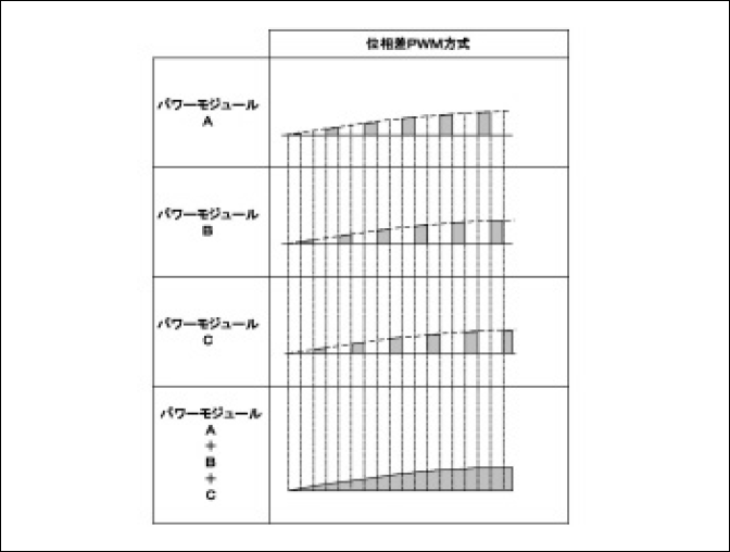 スイッチング部(図2のTr1~4)においてPWM信号で波形を切り取る際に入力側に高調波電流が発生する。複数のランプに対して同じタイミングで切り取りを行うと各パワーモジュールの入力高調波電流が重なり大きなスパイク電流となる。これを最小に抑えるために位相差PWM方式を開発した。図5にその入力電流波形を示す。切り取る位相を同一電源相に接続されているパワーモジュールについて僅かにシフトさせることにより電流の重なりを防ぐことができるため、小さな入力フィルタで力率の向上を実現できる。