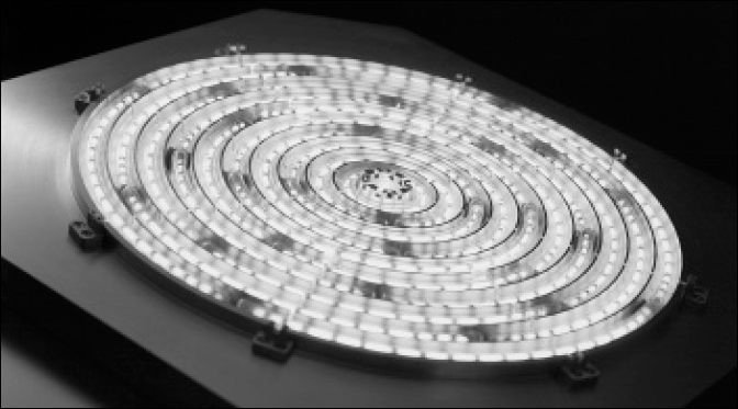 リング状ハロゲンランプを29本(11ゾーン)配列させた光源部を試作し、PWM制御方式の電源の力率を測定した。光源部の写真を図6、力率の測定結果を図7に示す。広い電力範囲に渡って0.97を超える高い力率が得られた。電力10%以下の領域で力率が低下しているのは、入力電流が減少し、相対的に入力フィルタに流れる電流(無効電力分)の比率が増加する為である。しかし、この領域においてもサイリスタに比較すると十分大きな力率を維持している。