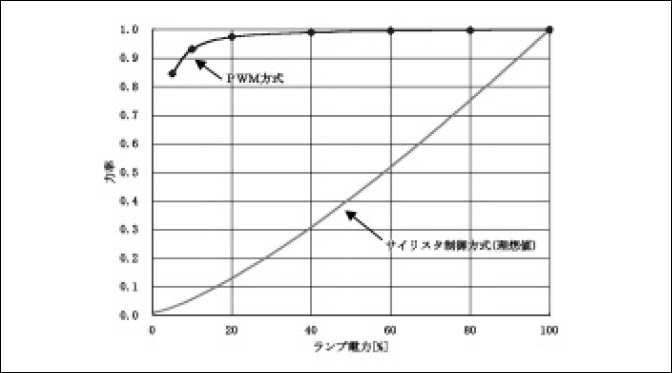 実際の加熱シーケンスでランプへの投入電力の変化を見ると、フルパワーが必要なのは昇温時だけであり、目標温度到達後の定温制御時はフルパワーの10~30%程度の電力である。従来のサイリスタを使った電力制御では投入電力が低いほど効率(力率)が低下する。これは波形が歪むことにより無効電力が発生するためである。特にエピタキシャルやCVDなどの高温保持時間が長いプロセスでは供給電力量の増大が顕著である。