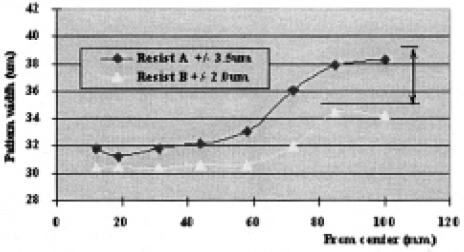 The performance of critical dimension uniformity with different DFR is shown in Figure 3. Both DFR were processed under the same conditions at just focus with optimal energy, with UPL-38EX lens.