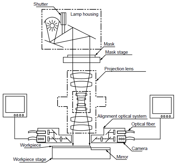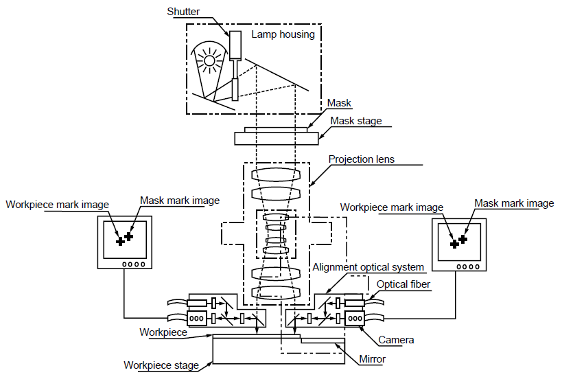 This allows perfect matching of the mask alignment mark and workpiece alignment mark and completes the alignment process. The alignment optical system is retracted from the workpiece stage and the system starts the exposure process.