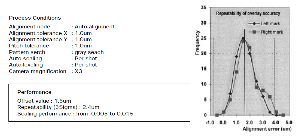In order to achieve a high overlay accuracy, auto scale function is very effective, however, there are other critical problems in the alignment process. Those are unstable shape, contrast and appearance of alignment marks on the substrate, which make the alignment performance deteriorated. The alignment mark detection method of the step-and-repeat exposure system is pattern matching with gray image processing. The recognition condition of the alignment marks varies depending on the photoresist, under-layer, etc. Therefore, the alignment accuracy is greatly affected by the recognition condition.