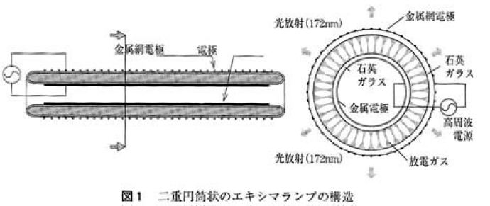 エキシマランプには誘電体バリア放電2)3)を利用したもの,マイクロ波放電 2)を利用したもの,ホローカソード放電 4)を利用したものなどがある。市販されているものは誘電体バリア放電を利用したエキシマランプのみである。誘電体バリア放電エキシマランプ(以下エキシマランプと呼ぶ)の構造,特徴について簡単に説明する。誘電体バリア放電は放電の一種であるが,大きな特徴は通常の放電ランプと異なり放電電極間に誘電体(ガラス,セラミックスなど)が存在することである。誘電体が存在することでアーク放電への移行を妨げ,エキシマ発光を可能にしている。代表的な,2重円筒構造を持つエキシマランプを図1に示す。内外ガラス管壁には電極が配置されており電極間に高周波電圧が印加される。電源周波数は商用周波数からMHz帯まで使用される5)6)。石英ガラスで囲まれた空間に充填された放電ガスが高周波電源による放電によってエキシマ発光するが,発光する波長特性は放電ガスの種類によって決まる。Xeは172nm,KrClは222nm,XeClは308nmに発光中心波長を持つ。それぞれの分光分布を図2に示す。実用上単色光とみなすことができるなど,エキシマランプには下記のような特徴がある。