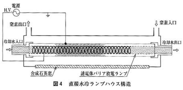 Xeエキシマランプを搭載したランプハウスの概略構造を図3に示す。安全性,メンテナンス性重視の観点よりランプ冷却には間接冷却方式を採用している。図4に示すような直接水冷方式もあるが,①冷却水が高電圧側になり漏電対策が必要,②漏水の心配がある,③寿命末期ランプ破損時の漏水対策が必要,④メンテナンス性が悪い,などの問題がある。