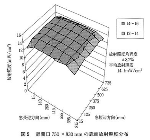 写真1に750x940mmの窓面を持つ平面光源の写真を示す。また,750x830mm平面光源の窓面放射照度分布を図5に示す。窓周辺で照度低下しているが720x800mmの範囲で窓面放射照度の均斉度は±8.7%程度である。