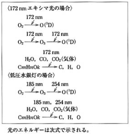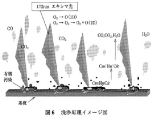 紫外線オゾン洗浄は紫外線を使って活性酸素を発生させ,同時に基板表面に付着した有機物を分解,酸化揮発除去するドライ洗浄方法である。200nm以下の短波長の光はVUV(Vacuum Ultra Violet)と呼ばれ,172nmエキシマ光を使った洗浄(VUV/O3洗浄 )は254nmを使う低圧水銀灯の洗浄(UV/O3洗浄)と区別される。以下に172nmエキシマ光と低圧水銀などの場合の洗浄原理を示す。また,172nmの場合の洗浄イメージを図6に示す。