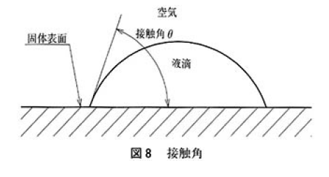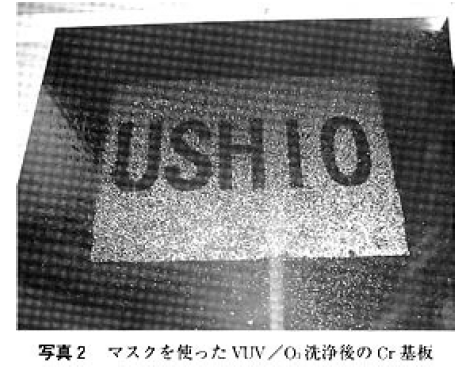 式より分かるように,光のエネルギーは波長が短くなるほど大きくなる。すなわち,波長が短くなるほど有機物を分解する能力が大きくなることを意味している。また,活性酸素(O(1D))は洗浄に大きく寄与するが,175nm以下の波長の光は直接酸素を分解することができ,172nmエキシマ光は活性酸素の生成能力にも優れている。従来のUV/O3洗浄と172nmエキシマVUV/O3洗浄の洗浄実験の結果を図7に示す。図中の接触角の変化は洗浄の程度を現わしている。172nmエキシマVUV/O3洗浄は従来方式に比べて5倍以上の洗浄速度を持つ。接触角は洗浄の効果を評価するための簡便な方法で,図8に示すように,基板上に置かれた水玉と基板表面の角度のことである。表面の有機物汚染が除去され,親水性になれば接触角は小さくなり,水玉は薄く大きくなる。写真2はUSHIOの文字を切り抜いた基板を400x500mmCr基板上に置いてエキシマVUV/O3洗浄し,その後水滴を噴霧したものである。未洗浄部分は水滴が粒状になり,光を反射して白く見える。洗浄され親水化した部分は水滴が薄く広がったため光の反射がなく,黒く見える。