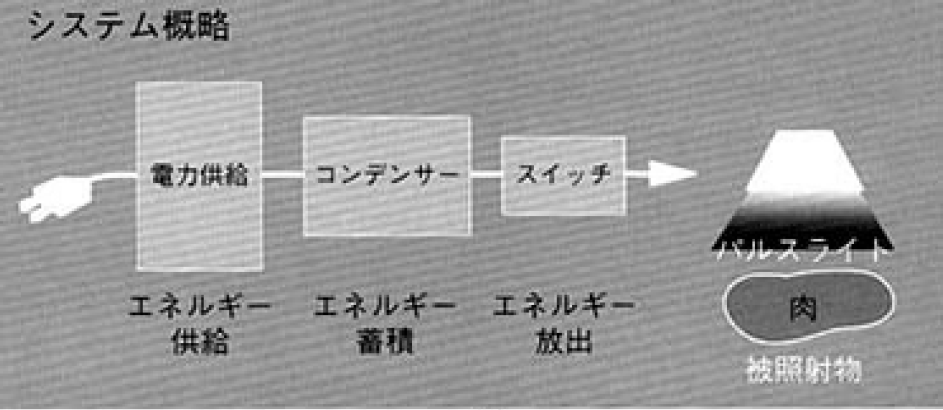 閃光パルス殺菌のメカニズムは,明確に解明されている訳ではなく,今後の研究が待たれるが,次の2点にあると考えられている。