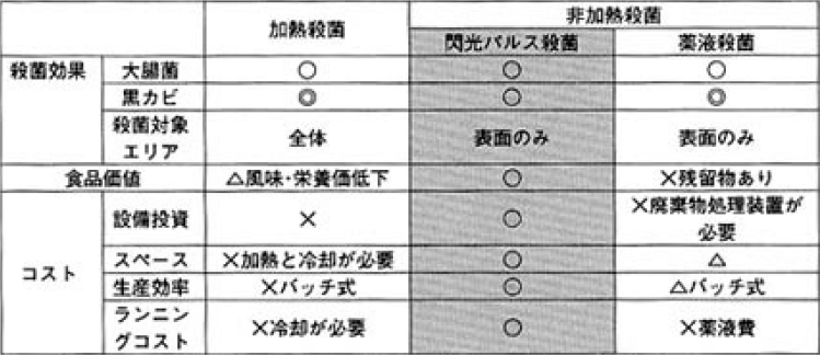 現在使用されている各種殺菌システムとの比較は表1の通り。加熱や薬液というと非常に多くの殺菌システムが展開されており,この比較データはあくまでも代表的なシステムを選択し比較を行った。ここでいう薬液とは次亜塩や過酸化水素を対象としている。閃光パルス殺菌は非常にバランスの取れた殺菌システムである事がわかる。