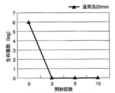 次に殺菌効果の一例を記述する。これは全てシャーレー上での殺菌効果である。これは凹凸の無いフラットな状態でのテスト効果で有り,実際の食品や包装材料を用いた場合には,食品表面 の凹凸,菌の重ね合せ等により,殺菌効果は低下する。