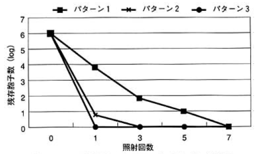 紫外線殺菌では,殆ど効果がないと言われているA-nigでの殺菌効果を図4に示す。3タイプの殺菌効果 を表示しているが,これはランプの発光エネルギーを変更したもの。パターン3の光出力が最も強くなっている。