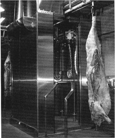 図5は食肉分野への応用展開例で,枝肉と呼ばれる加工前の食肉殺菌システムである。このシステムは“食品生産技術研究組合”の“平成9~12年度牛肉処理高度自動化システム開発事業”の開発テーマの一つで,フジチク株式会社が開発を担当され,杏林化工株式会社(名古屋市)より発売されるシステムとなっている。これ以外にも加工肉殺菌システムの検討も実施中で実用化を目指した検討を行っている。