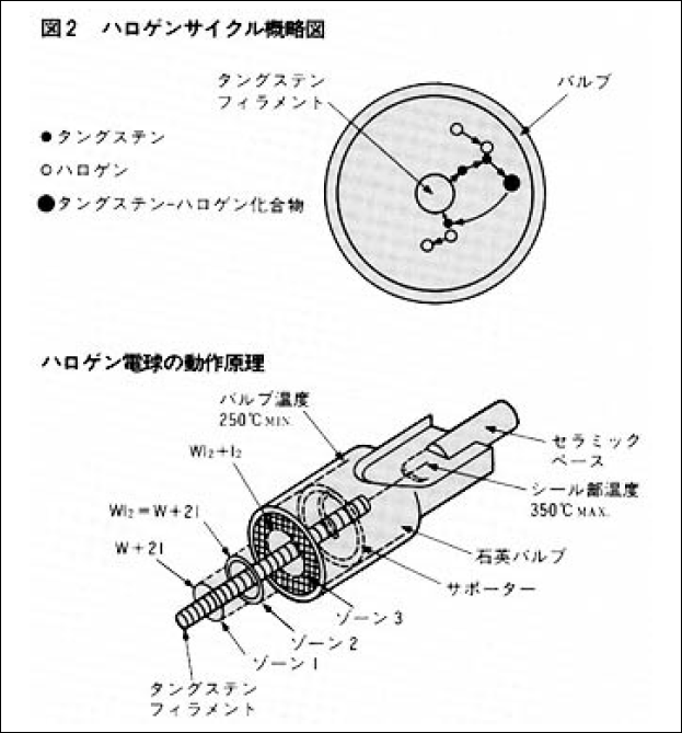 白熱電球は、発熱体を電流によって白熱状態に加熱し光を放射します。ふつう白熱電球には、高融点(約3400°C)のタングステンフィラメントが使われています。タングステンは融点以下ですでに蒸発が始まり、これによってフィラメントはやせほそり、やがて最終的にある位 置で切れてしまいます。これが白熱電球の自然寿命です。また、電球のバルブ内壁は、蒸発したタングステンの付着によって黒化していき、外部に放射される光がだんだん減少し、その減少率は20%近くにも達します。このような、タングステンの蒸発を防止するために、ハロゲンガスが有効であることが判明しました。