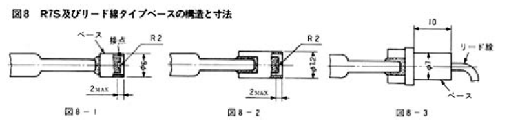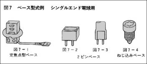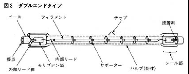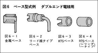 ハロゲン電球のベースは、高温で使用されるため、材料は、通常、ステアタイトあるいは耐熱性金属が使用されます。ダブルエンドタイプのハロゲン電球には、従来、使いやすいR7Sベースが使われることが多かったのですが、最近では、ヒーターなどにおいてソケットが設計しやすく、接点の接触不良の心配の少ないリード線タイプベースの使用が増えています。
