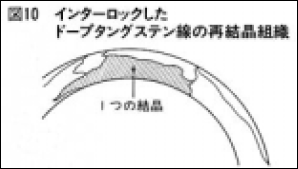 ハロゲン電球のフィラメントには、線の柔軟性と高温での蒸発率の低いことからタングステン線が用いられます。そして長時間使用中のフィラメント変形防止(ノンサグ性)のために、タングステン線の軸方向に長く伸び、かつ互いにインターロックした再結晶組織(図10)をつくる特別 な仕様のタングステン線を使用します。