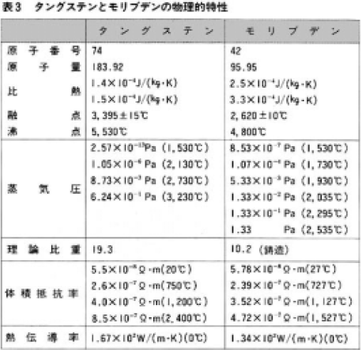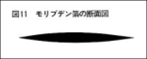 モリブデンは、シール部で、ハロゲン電球の内と外を電気的に接続する箔として使用されています。このモリブデン箔は、厚さ数10µmで図11のように、フェザーエッジになっています。これによって、シール部の気密性が保たれます。表3にモリブデンの特性を示しています。