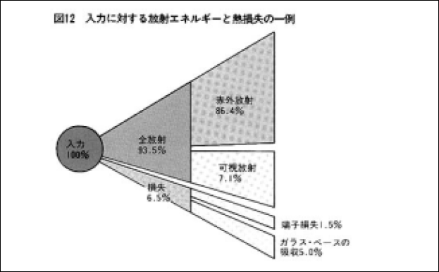 一般に電球に入力される電力の75~95%が光と熱として放射されます。そのうち6~12%が可視光として放射され、残りは赤外線となります(図12)。この割合は電球の構造等によって変わります。