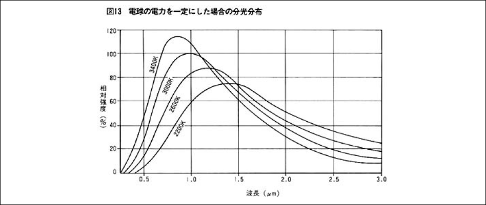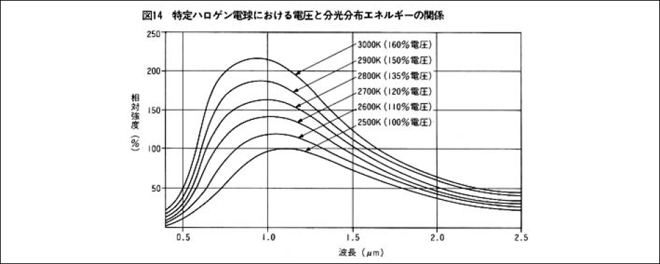 ハロゲン電球の色温度と分光分布の関係は図13のようになります。同図が示すように色温度が高くなると短波長側、すなわち可視光側にピークが移り、光出力が増加します。