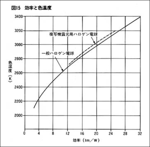 効率と色温度の関係を図15に示します。複写機用の光源に使用されるセグメントタイプのフィラメント構造になった場合は、発熱体が小さくなり、不発光部などへの熱損失が大きくなります。そのため、一般ハロゲン電球に比べ同一効率なら色温度が少し高くなります。