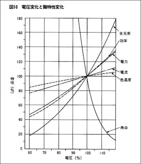 この式に基づけば、定格電圧に対し90%の電圧で点灯した場合に、寿命は約3倍に、また、110%で点灯すれば約1/3になります(図16)。ただし、ハロゲン電球には、定格電圧で最適なハロゲンサイクルが働くように、そのフィラメント温度(色温度)に合わせた濃度のハロゲンガスが封入されています。したがって、電圧を下げて使用した場合、フィラメント温度が低くなり相対的に濃い濃度のハロゲンガスとなり、フィラメントは浸食されて短寿命になりやすく、また過電圧で使用した場合には、フィラメント温度は高くなり相対的に薄い濃度のハロゲンガスとなりますのでバルブの黒化が起こりやすくなります。