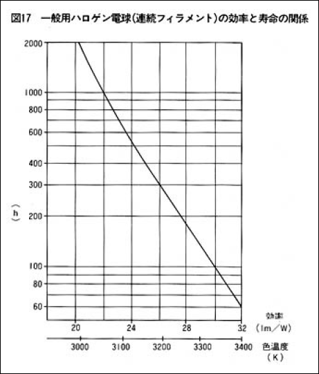 電球寿命(フィラメント寿命)は、フィラメントからのタングステンの蒸発速度に関連し、蒸発速度はフィラメント温度すなわち効率に比例しています。
