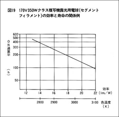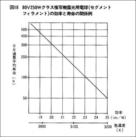 一般用ハロゲン電球および複写機露光用のハロゲン電球における効率と寿命(平均)の関係を図17-図19に示しています。